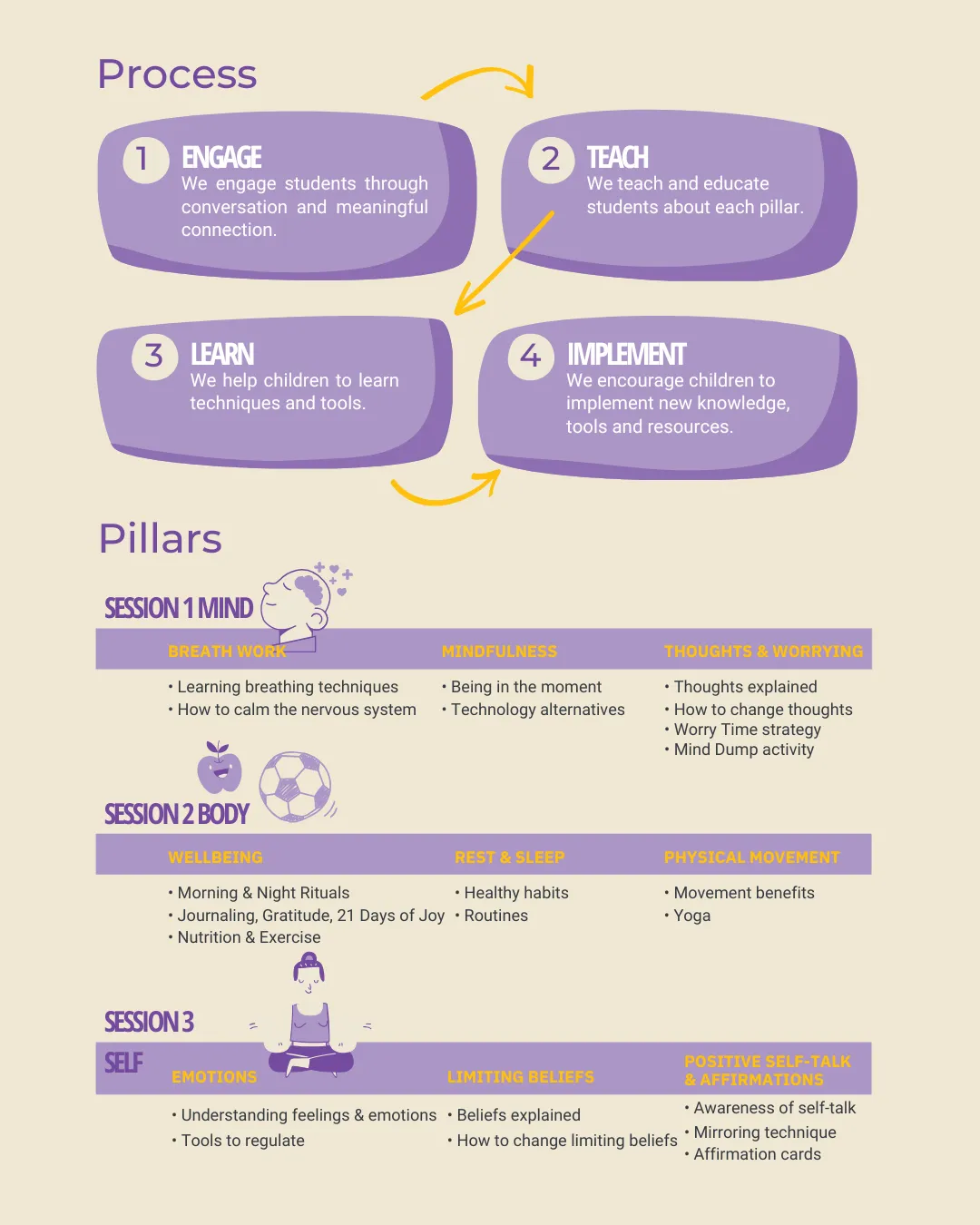 The course includes three core pillars of Mind, Body and Self and the program takes a comprehensive approach to student wellbeing, addressing physical, emotional and mental health.